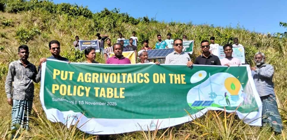 সুনামগঞ্জ প্রতিনিধি: বাংলাদেশের নবায়ন যোগ্য জ্বালানি নীতিমালায় বিজলী কৃষি কে অন্তর্ভুক্ত করার দাবীতে সুনামগঞ্জের চিনাউড়ার আনারস বাগানে কৃষক সমাবেশ অনুষ্ঠিত হয়েছে। দেশের অধিকাংশ ভুমি কৃষিজমি হওয়ায় বৃহদাকৃতির সোলার নির্ভর বিদ্যুৎ কেন্দ্র গড়ে তোলা কঠিন হলেও কৃষি জমিতে সোলার নির্ভর বিদ্যুৎ ছোট ছোট বিদ্যুৎ প্লান্ট গড়ে তোলা অতি সম্ভাবনাময়। জলবায়ু পরিবর্তনের ঝুঁকি মোকাবিলায়, কৃষি উৎপাদনশীলতা বৃদ্ধিতে নবায়নযোগ্য জ্বালানি নীতিমালায় বিজলি কৃষি অর্থাত কৃষি জমিতে বিদ্যুৎ উৎপাদন নীতিমালা অন্তর্ভুক্ত করার দাবীতে উক্ত কৃষক সমাবেশে কৃষক, তরুণ এবং পরিবেশ কর্মীরা অংশগ্রহন করেন।