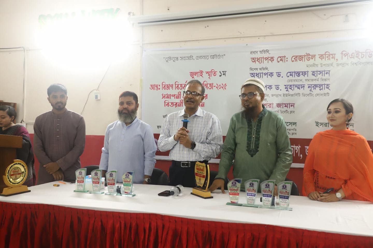 মুসফিকুর রহমান, জবি প্রতিনিধি: জগন্নাথ বিশ্ববিদ্যালয়ের (জবি) সমাজকর্ম বিভাগের আয়োজনে এবং সোশ্যাল ওয়ার্ক ডিবেটিং ক্লাবের তত্ত্বাবধানে আয়োজিত  “জুলাই স্মৃতি প্রথম আন্তঃবিভাগ বিতর্ক প্রতিযোগিতা ২০২৫”-এর চূড়ান্ত পর্ব, সমাপনী অনুষ্ঠান ও পুরস্কার বিতরণীতে প্রধান