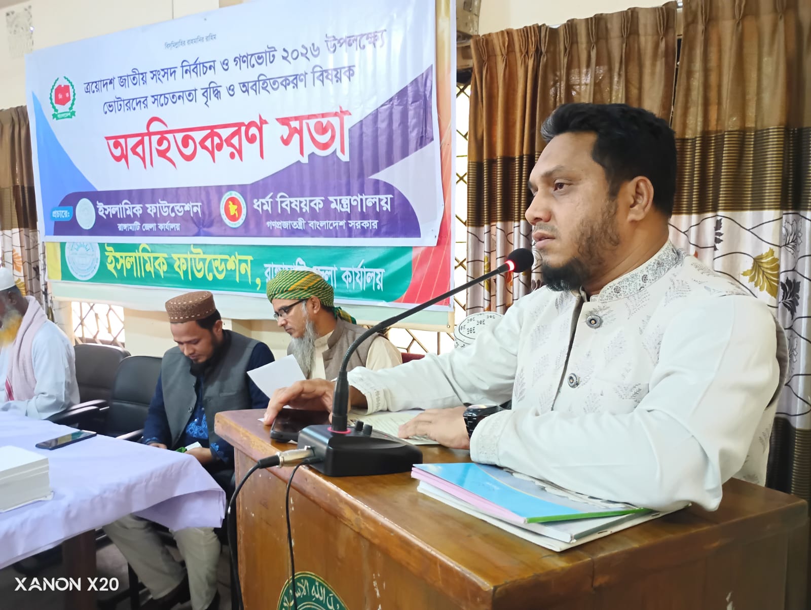 আহমদ বিলাল খান: “দেশের চাবি আপনার হাতে”এই প্রতিপাদ্যকে সামনে রেখে আসন্ন ত্রয়োদশ জাতীয় সংসদ নির্বাচন ও গণভোট–২০২৬ উপলক্ষে ভোটারদের সচেতনতা বৃদ্ধির লক্ষ্যে ইসলামিক ফাউন্ডেশন রাঙ্গামাটি জেলা কার্যালয়ের উদ্যোগে এক গুরুত্বপূর্ণ উদ্বুদ্ধকরণ সভা