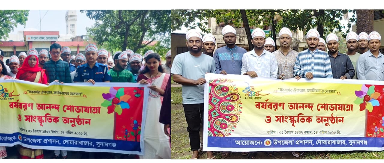 দোয়ারাবাজার (সুনামগঞ্জ) সংবাদদাতাঃ নানা আয়োজনে বাঙালিদের ঐতিহ্য পহেলা বৈশাখ উদযাপন করেছে সুনামগঞ্জের দোয়ারাবাজার উপজেলা পরিষদ। সোমবার ( ১৪ এপ্রিল) বাংলা নববর্ষ ১৪৩২ উপলক্ষে উপজেলা প্রশাসনের উদ্যোগে সকালে উপজেলা পরিষদের সামন থেকে বর্ণাঢ্য