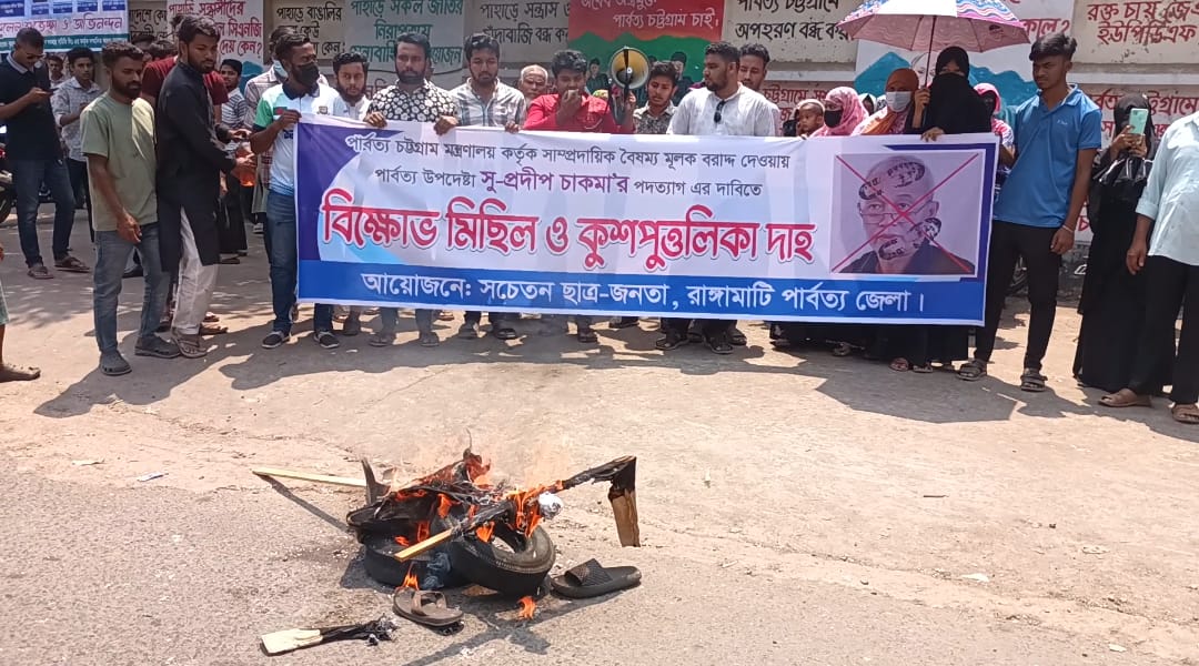 পার্বত্য উপদেষ্টা সুপ্রদীপ চাকমার কুশপুত্তলিকা পোড়াল পার্বত্য চট্টগ্রামের ছাত্র-জনতা