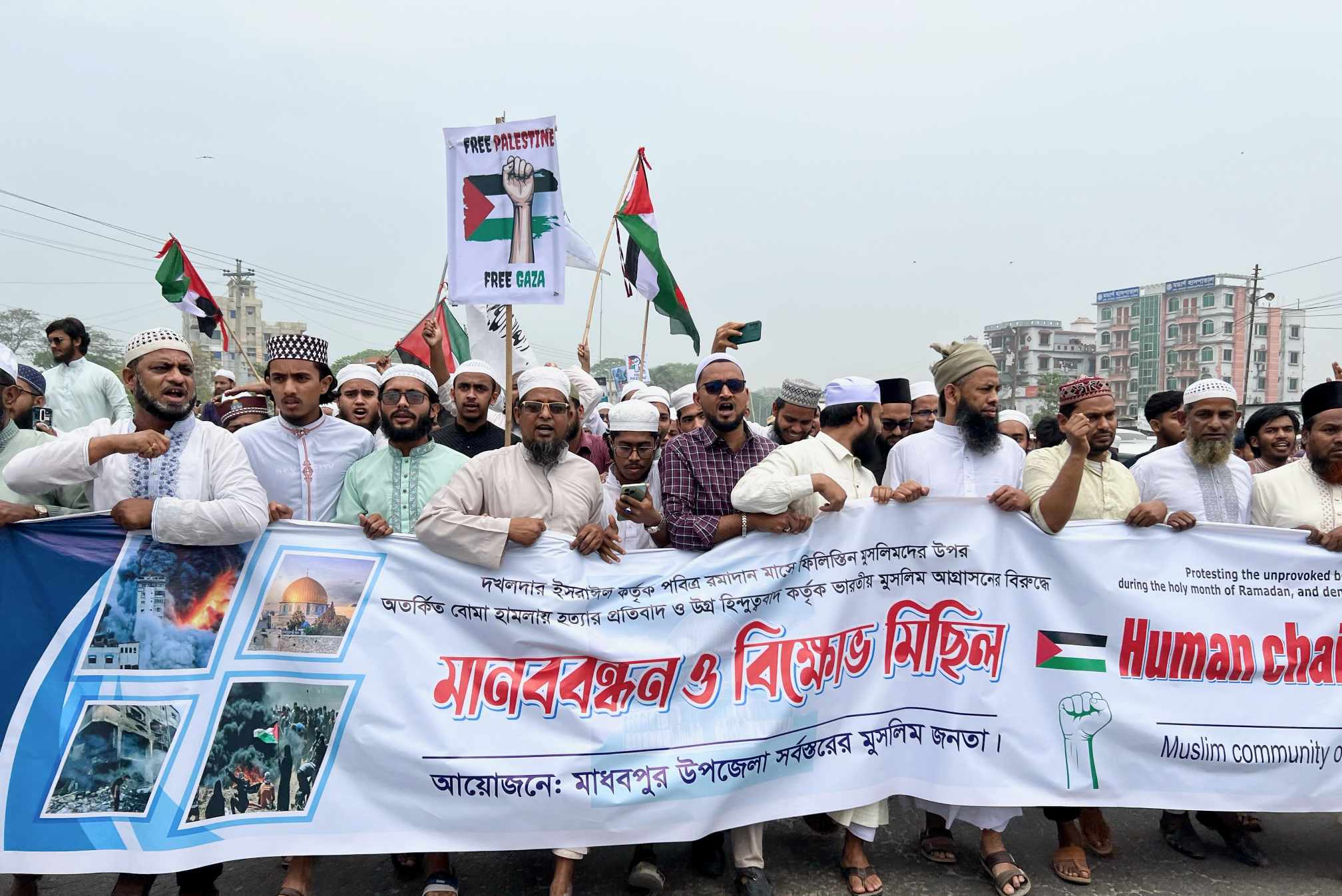 গাজায় দখলদার ইসরায়েলের হামলার প্রতিবাদে মাধবপুরে বিক্ষোভ মিছিল