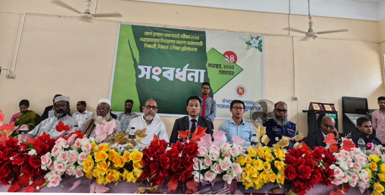 সোহেল মিয়া, দোয়ারাবাজার (সুনামগঞ্জ): সুনামগঞ্জের জেলা প্রশাসন মেধা যাচাই পরীক্ষায় দোয়ারাবাজার উপজেলায় সাফল্য অর্জনকারী শিক্ষার্থী,শিক্ষক ও শিক্ষার্থীদের সংবর্ধনা প্রদান করেছে দোয়ারাবাজার উপজেলা প্রশাসন। সোমবার (২৪ নভেম্বর) বিকালে দোয়ারাবাজার উপজেলা পরিষদের হলরুমে এই