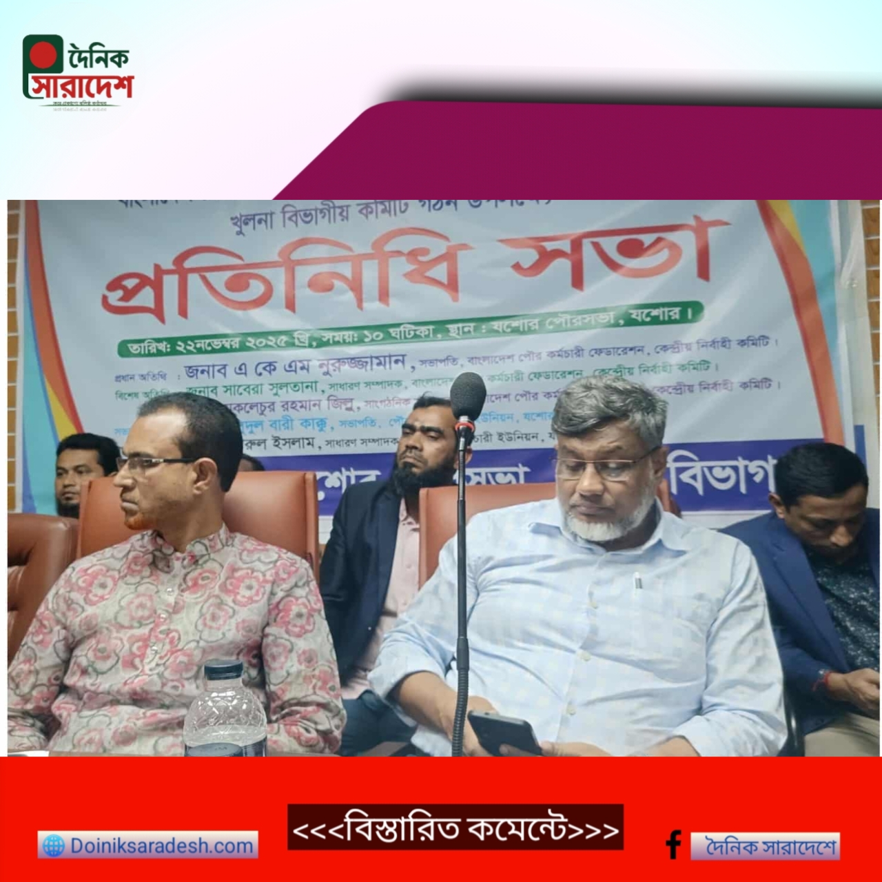 রবিউল হোসাইন সবুজ: অদ্য তাং ২২শে নভেম্বর ২০২৫ইং যশোর পৌরসভা কনফারেন্স হলরুমে অনুষ্ঠিত হয়। বাংলাদেশ পৌর কর্মচারী ফেডারেশন খুলনা বিভাগীয় প্রতিনিধি সভার সভাপতি, মাসুদুল বারীর সভাপতিত্বে প্রধান অতিথি হিসসেবে উপস্হিত ছিলেন, বাংলাদেশ