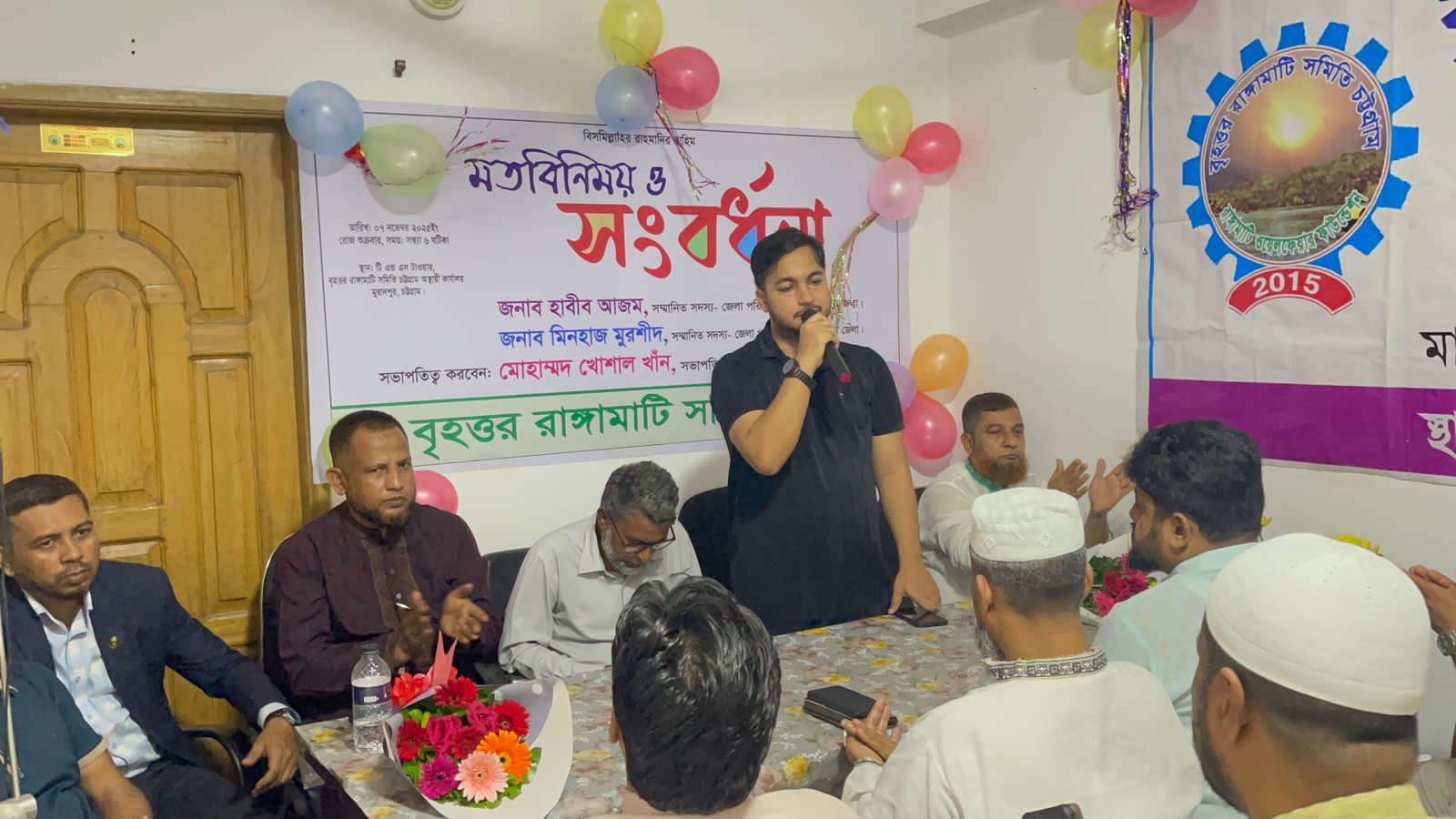 আহমদ বিলাল খান: বৃহত্তর রাঙ্গামাটি সমিতি চট্টগ্রামের উদ্যোগে চট্টগ্রামস্থ মুরাদপুরের টি এন্ড এস টাওয়ারে মতবিনিময় ও রাঙ্গামাটি জেলা পরিষদের সদস্য মোঃ হাবীব আজমের সম্মানে সংবর্ধনা অনুষ্ঠান অনুষ্ঠিত হয়েছে। শুক্রবার রাতে বৃহত্তর রাঙ্গামাটি