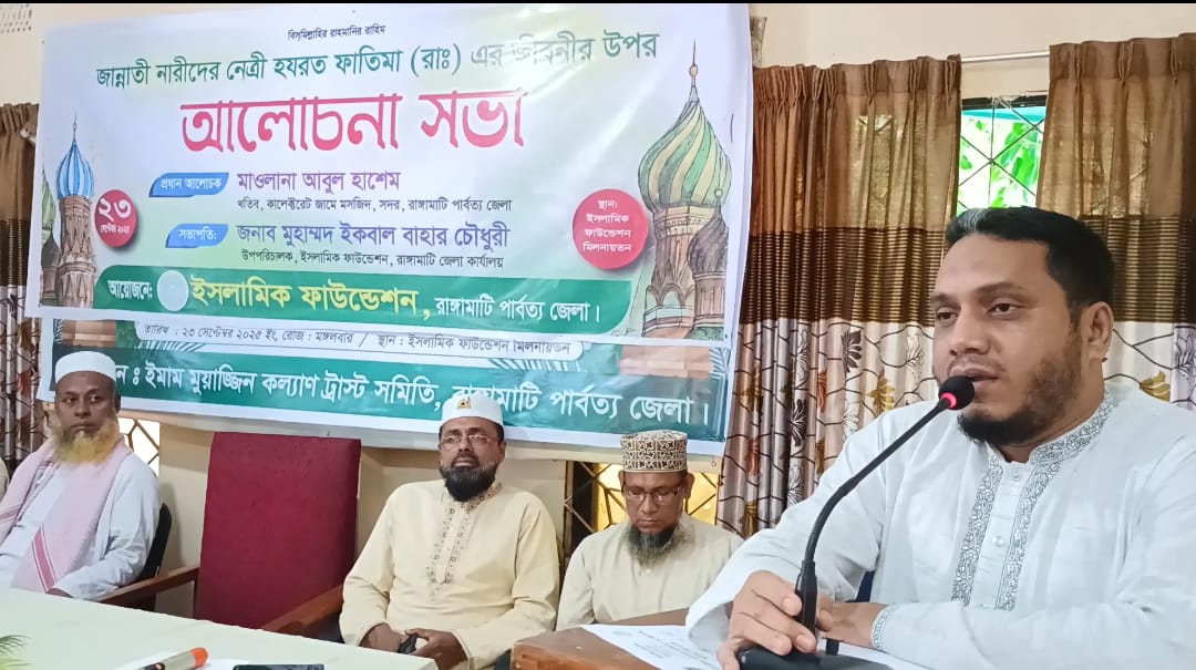 আহমদ বিলাল খান: ইসলামিক ফাউন্ডেশন রাঙ্গামাটি জেলা কার্যালয়ের আয়োজনে জান্নাতী নারীদের নেত্রী হযরত ফাতিমা রাদিয়াল্লাহু তা’আলা আনহা এর জীবনীর উপর আলোচনা সভা অনুষ্ঠিত হয়েছে। মঙ্গলবার (২৩ সেপ্টেম্বর) সকাল সাড়ে ৯টায় রাঙ্গামাটি ইসলামিক