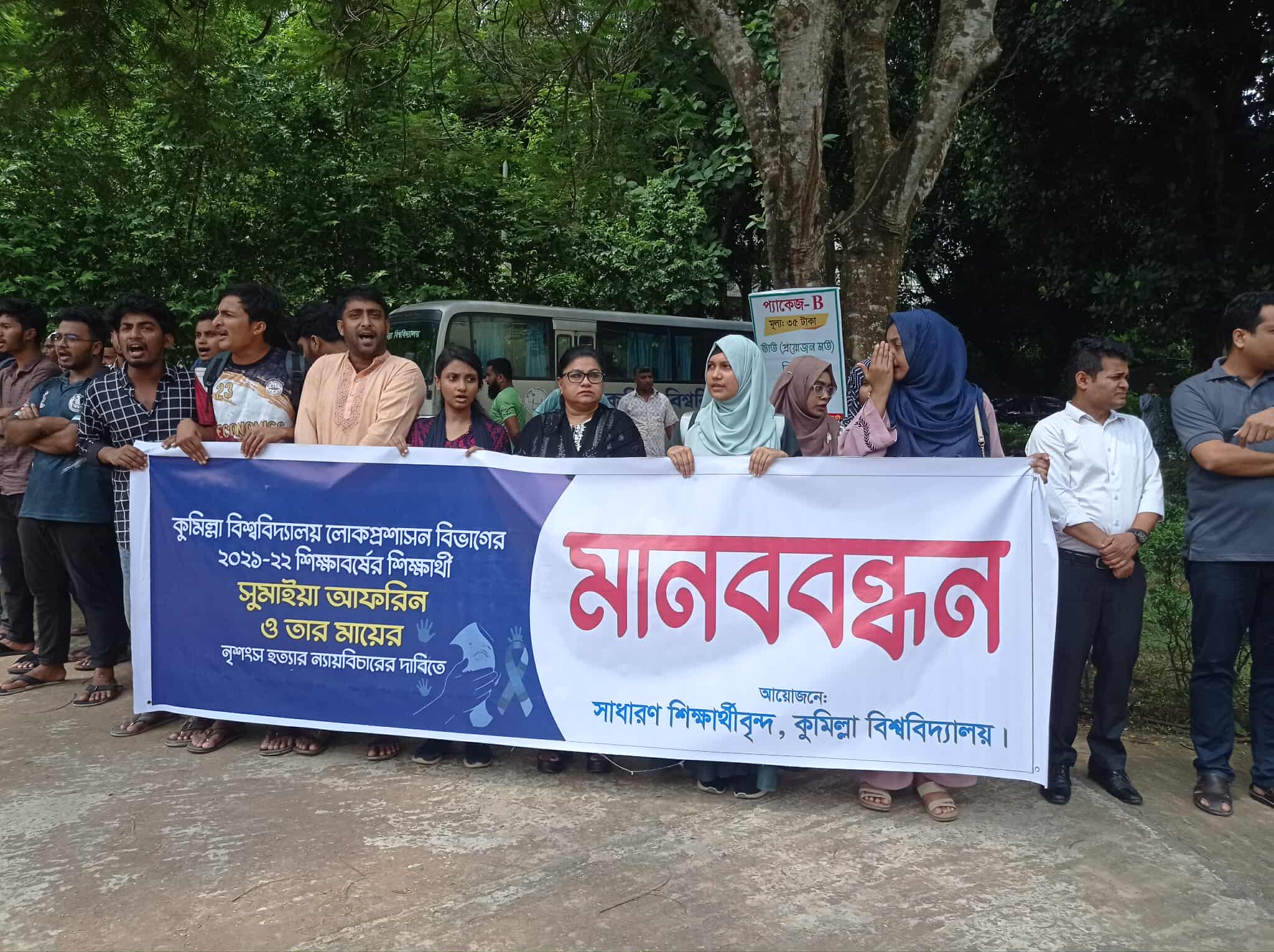 কুবি শিক্ষার্থী সুমাইয়া ও তার মায়ের হত্যার বিচার দাবিতে মানববন্ধন