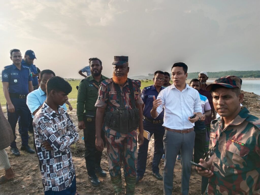 দোয়ারাবাজারে আন্তর্জাতিক সীমারেখা অতিক্রম করে বালু উত্তোলন প্রতিরোধে চেলা নদীতে প্রশাসনের লাল পতাকা স্থাপন
