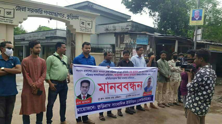 রিয়াজুল হক সাগর, রংপুর অফিস: কুমিল্লার আমার দেশ পত্রিকার জেলা প্রতিনিধি এম. হাসান ও লালমনিরহাটের আজকের পত্রিকার জেলা প্রতিনিধি খোরশেদ আলম সাগরের নামে মিথ্যা ও হয়রানিমূলক মামলা প্রত্যাহারের দাবিতে মানববন্ধন করেছে কুড়িগ্রাম সাংবাদিক ইউনিয়ন (কেজিইউজে)।