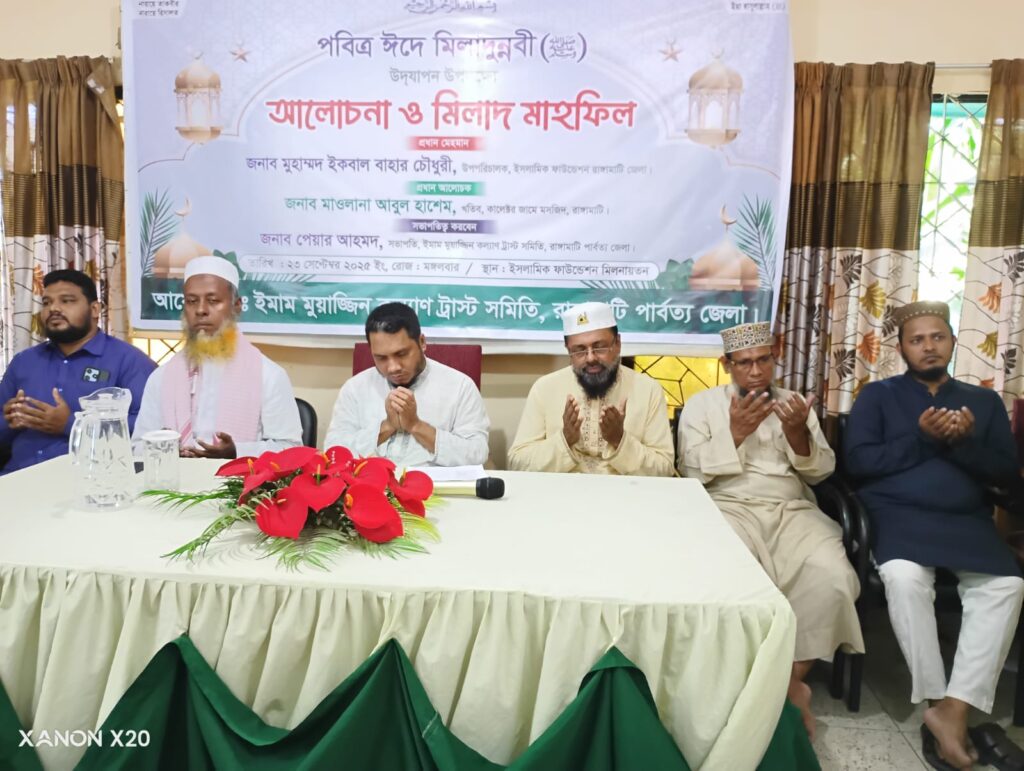 আহমদ বিলাল খান: পবিত্র ঈদে মিলাদুন্নবী (সা.) উদযাপন উপলক্ষে ইমাম মুয়াজ্জিন কল্যাণ ট্রাস্ট সমিতি রাঙ্গামাটি জেলা কার্যালয়ের উদ্যোগে আলোচনা সভা ও মিলাদ মাহফিল অনুষ্ঠিত হয়েছে।