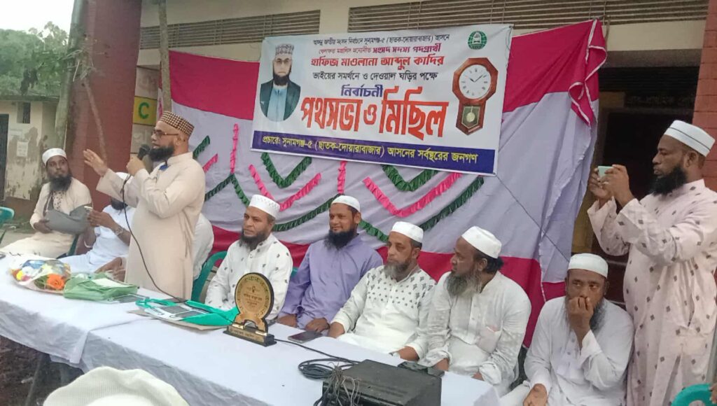 মোঃ তাজিদুল ইসলাম: আসন্ন জাতীয় সংসদ নির্বাচনকে সামনে রেখে খেলাফত মজলিস সুনামগঞ্জ-৫ (ছাতক-দোয়ারাবাজার) আসনে মনোনীত সংসদ সদস্য পদপ্রার্থী হাফিজ মাওলানা আব্দুল কাদির–এর সমর্থনে এক নির্বাচনী সমাবেশ অনুষ্ঠিত হয়েছে। গত শুক্রবার বাদ আছর চরচৌড়াই (আশাকারচর) পয়েন্টে এ সমাবেশে এলাকাবাসীর ব্যাপক উপস্থিতি লক্ষ্য করা যায়।
