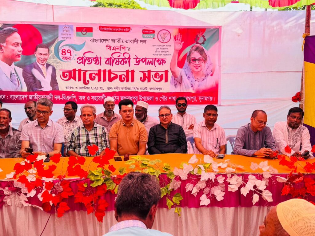 জগন্নাথপুর প্রতিনিধি: সুনামগঞ্জের জগন্নাথপুরে বাংলাদেশ জাতীয়তাবাদী দল-বিএনপি’র ৪৭তম প্রতিষ্ঠাবার্ষিকী উপলক্ষে এক দোয়া ও আলোচনা সভা অনুষ্ঠিত হয়েছে। বুধবার(৩ সেপ্টেম্বর) বিকাল ৩ ঘটিকায় উপজেলার লাকসির কার্যালয় সি/এ মার্কেট প্রাঙ্গণে উপজেলা ও পৌর বিএনপি এবং সহযোগী সংগঠনের যৌথ উদ্যোগে এ অনুষ্ঠানের আয়োজন করা হয়।
