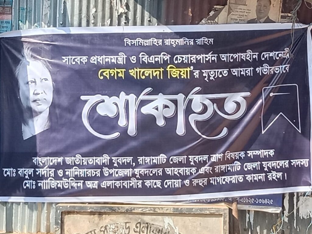 এই শোকাবহ সময়ে বাংলাদেশ জাতীয়তাবাদী যুবদল, রাঙ্গামাটি জেলা যুবদলের ত্রাণ বিষয়ক সম্পাদক ও নানিয়ারচর উপজেলা যুবদলের আহ্বায়ক মোঃ বাবুল সর্দার গভীর শোক প্রকাশ করে বলেন, বেগম খালেদা জিয়া ছিলেন সাধারণ মানুষের নেতা। দেশের দুঃসময়ে তিনি সবসময় মানুষের পাশে দাঁড়িয়েছেন। রাঙ্গামাটির মানুষও তাঁকে শ্রদ্ধার সঙ্গে স্মরণ করবে। তিনি মহান আল্লাহর কাছে তাঁর রুহের মাগফিরাত কামনা করেন।