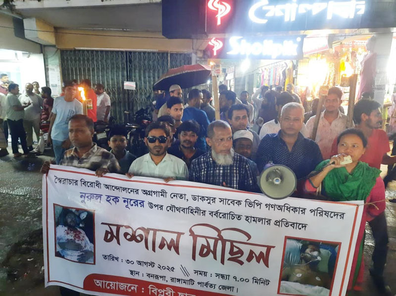 আহমদ বিলাল খান: ডাকসুর সাবেক ভিপি ও গণঅধিকার পরিষদের সভাপতি নুরুল হক নুরের ওপর নৃশংস হামলার ঘটনায় রাঙ্গামাটিতে মশাল মিছিল ও প্রতিবাদ সমাবেশ অনুষ্ঠিত হয়েছে।